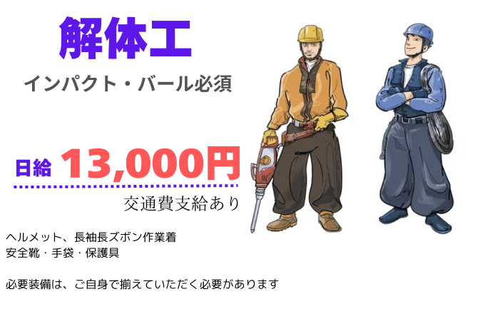 バール・インパクト持ち込みで 内装解体・木造一棟解体など解体職人として勤務できる方!